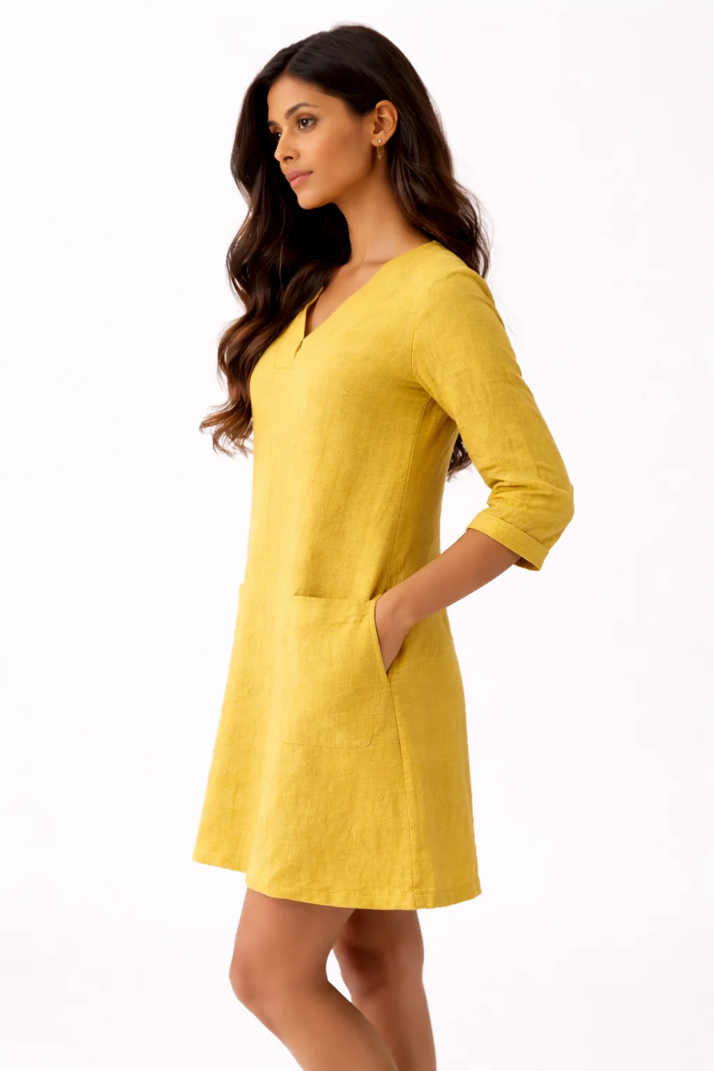 This stylish dress features a flattering V-neckline and a relaxed straight silhouette for effortless everyday wear. Designed with 3/4th sleeves and functional front pockets, it combines comfort with practicality. The minimal and modern design makes it perfect for casual outings, work wear, travel, or daily wear.
