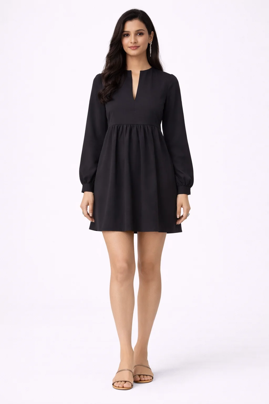 A flattering V-neck mini dress with puff sleeves and a chic A-line fit.